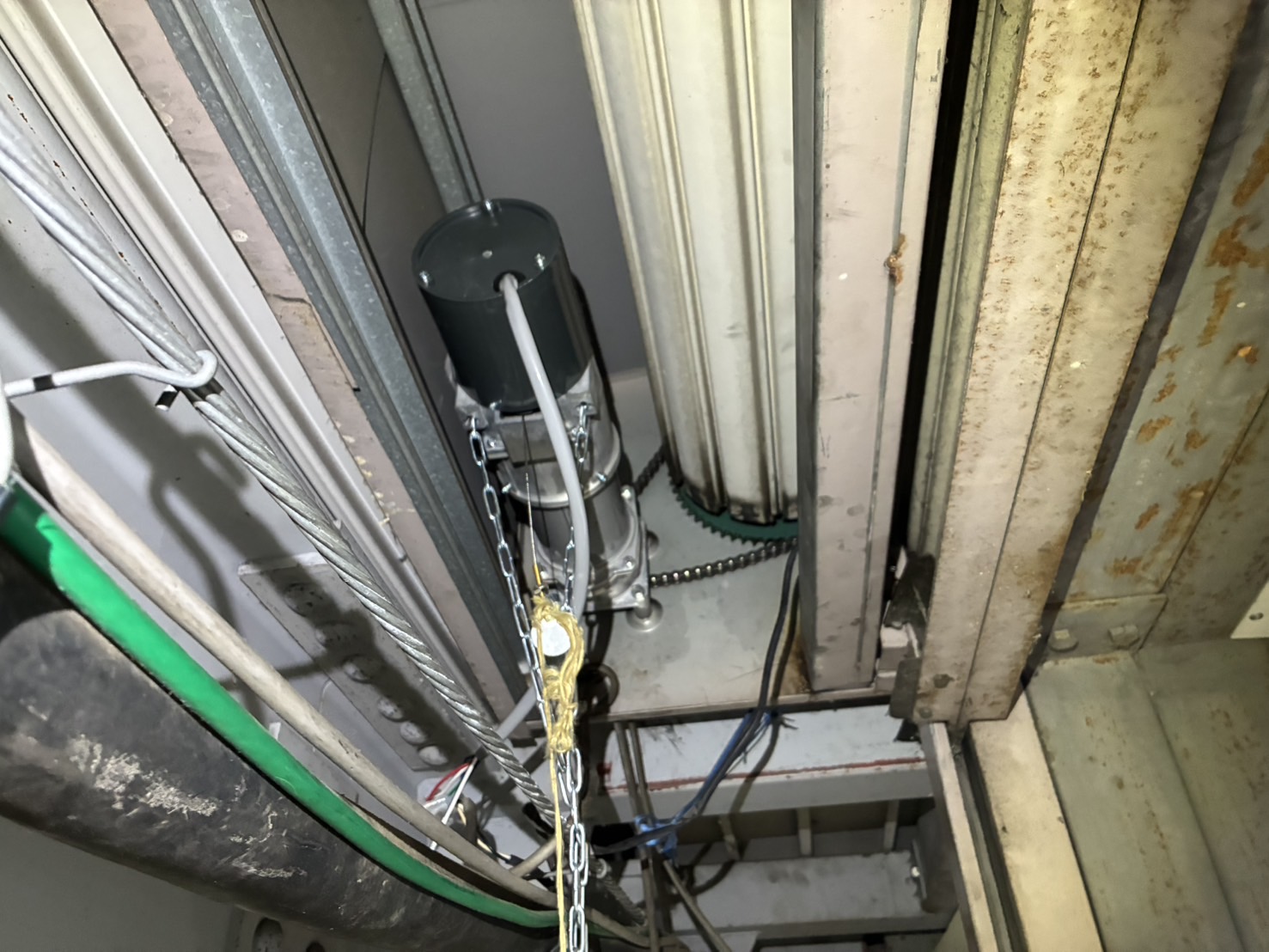 そのため、スラットの左右にチェンブロを取り付けてスラットが下がらないように固定し、その後モーター交換をしました。