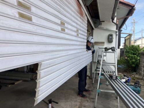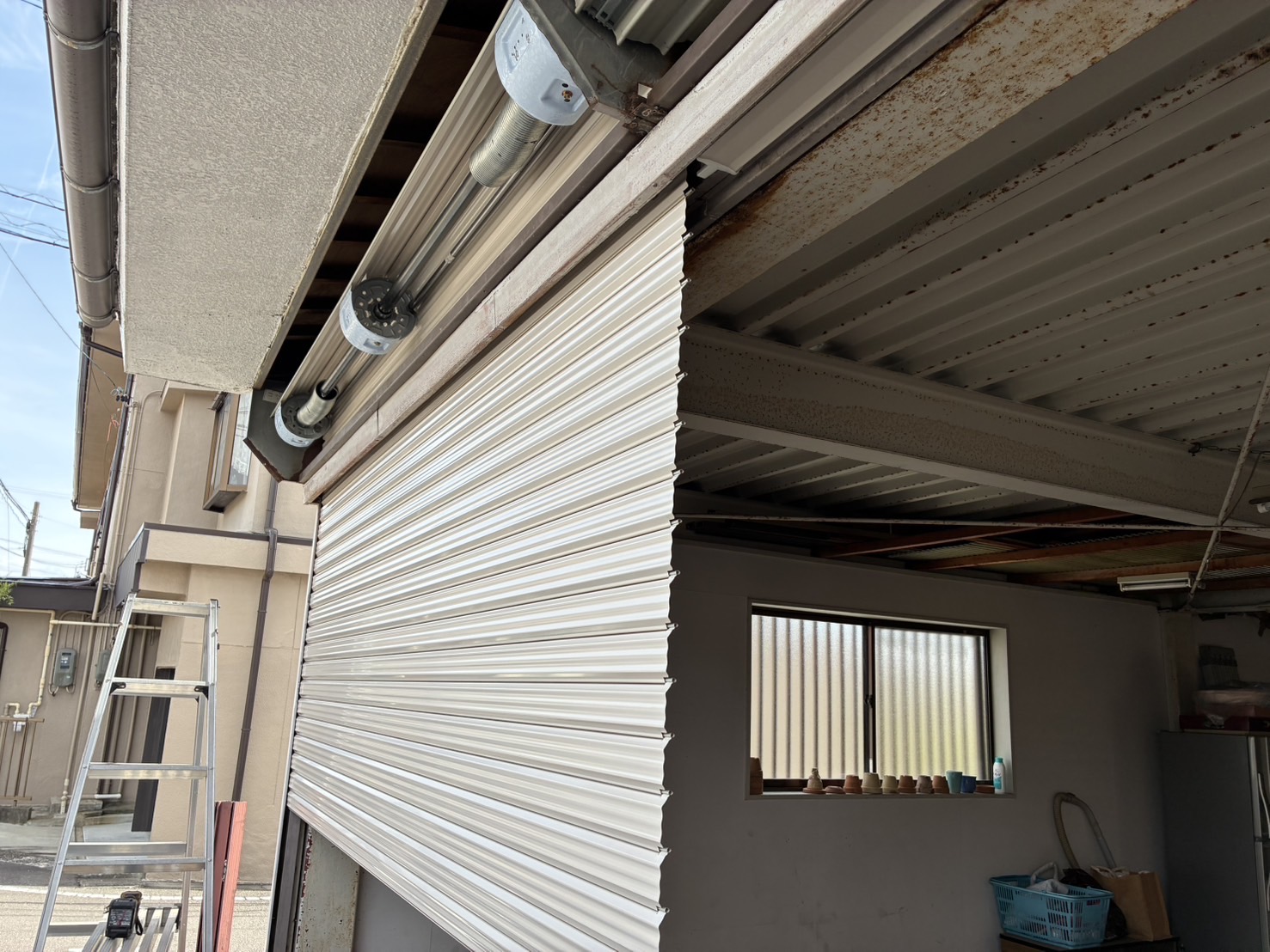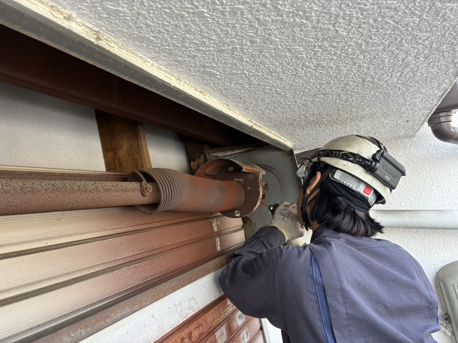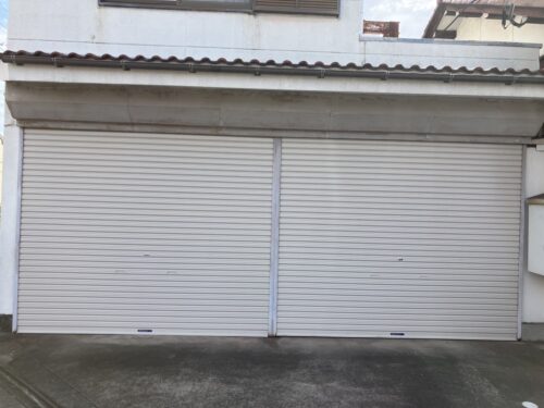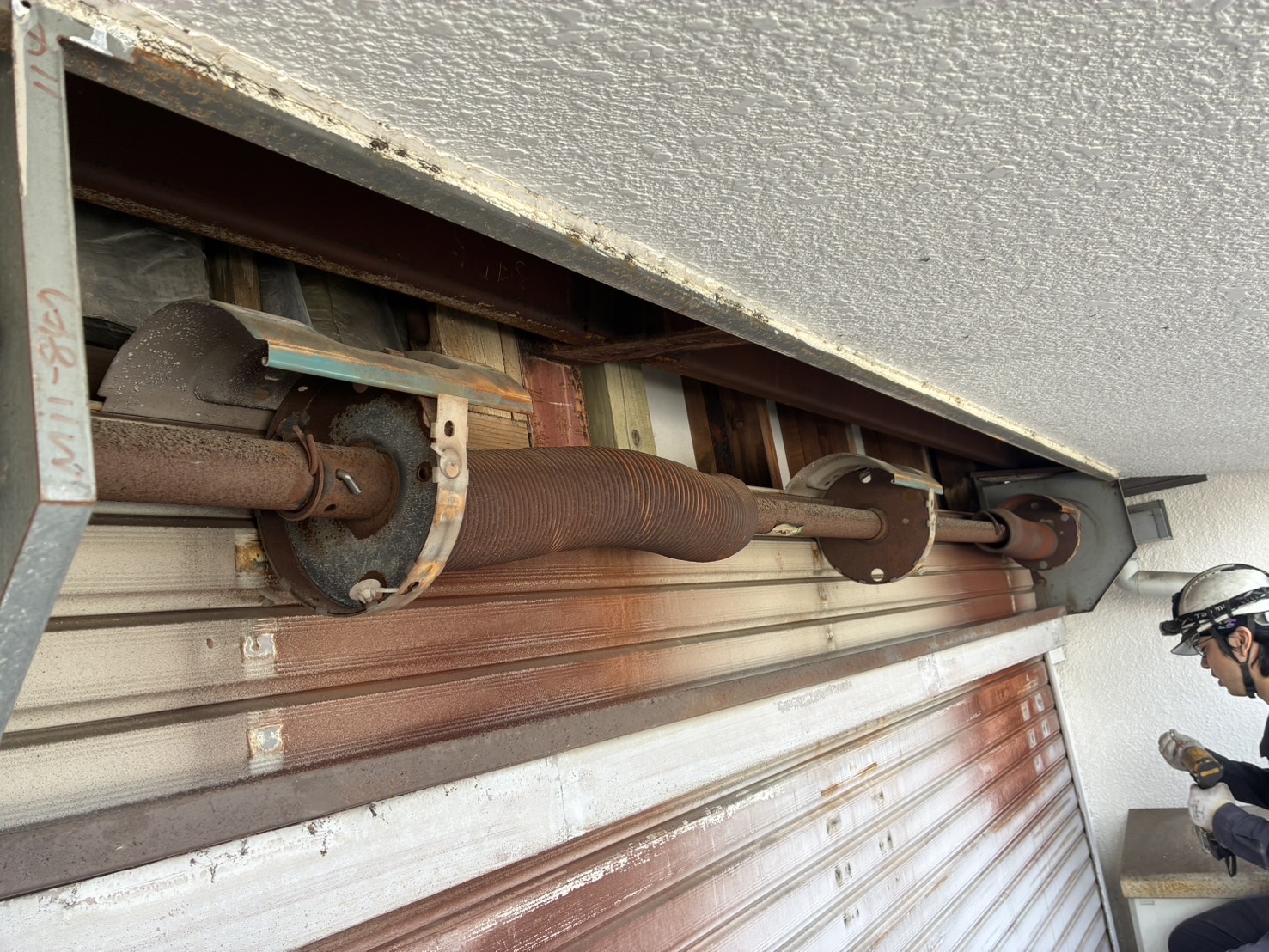 各務原市シャッター修理では、2連シャッターのスプリングシャフト・スラット・座板の交換工事をさせていただきました。