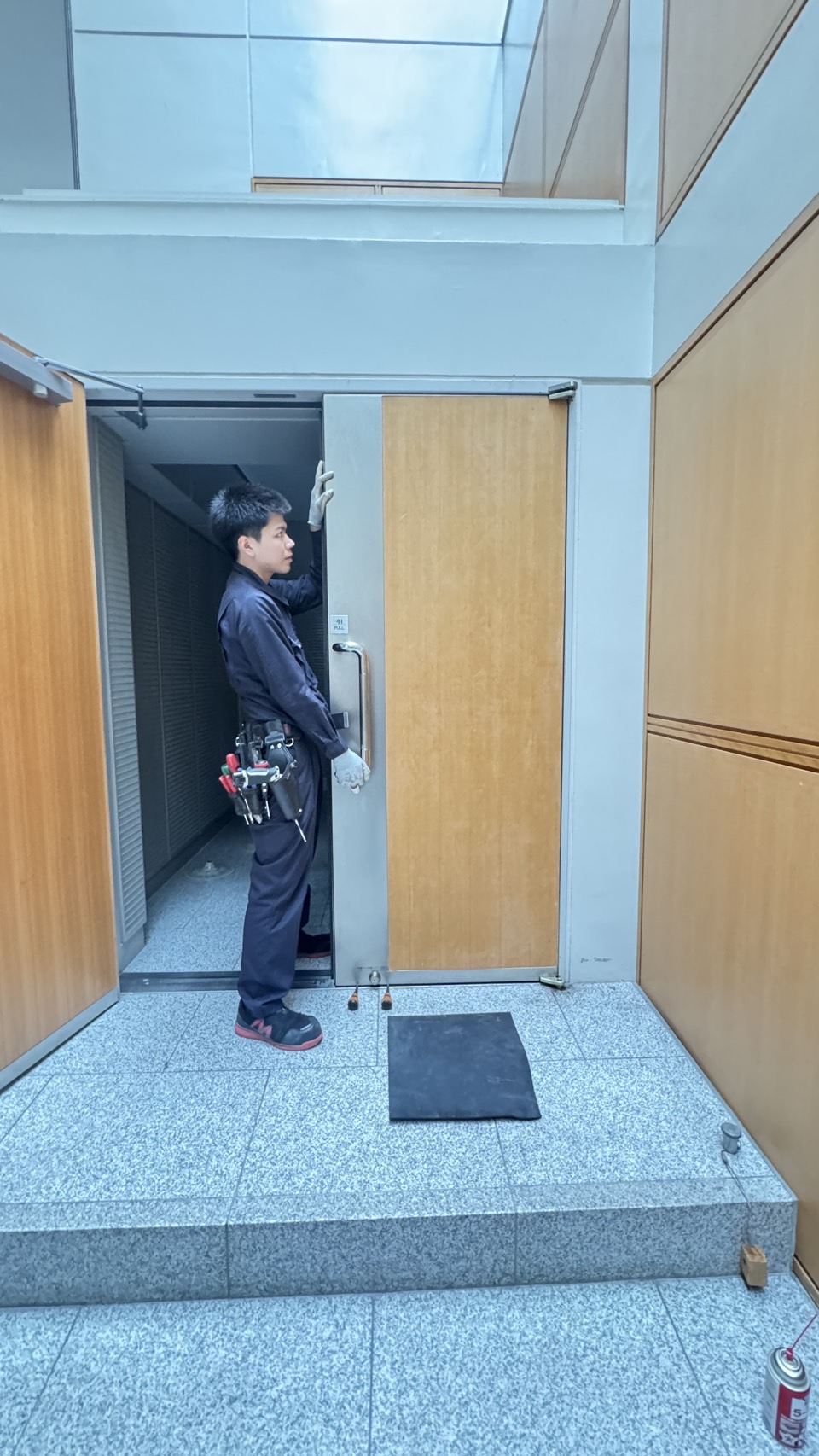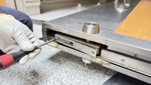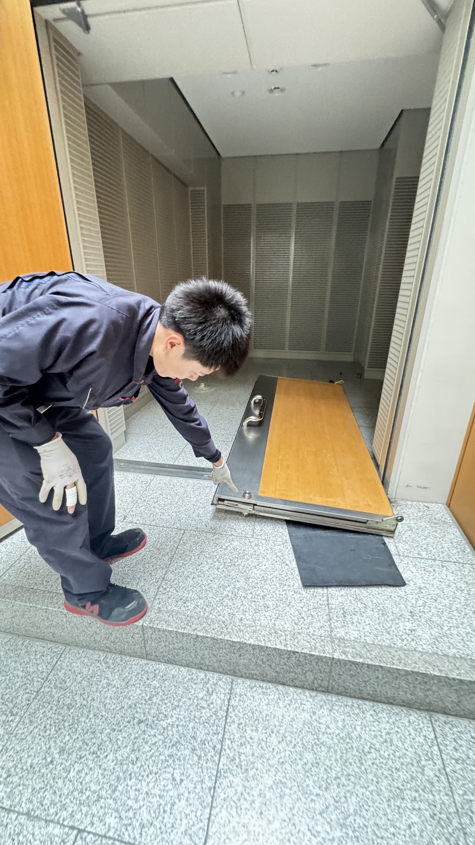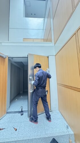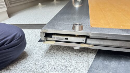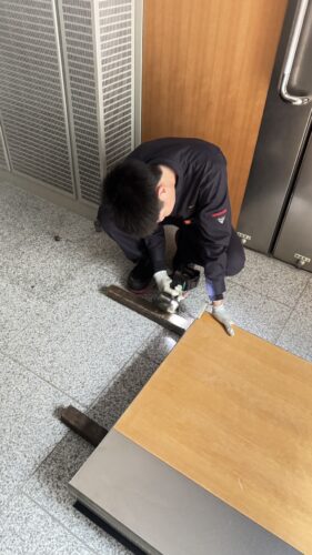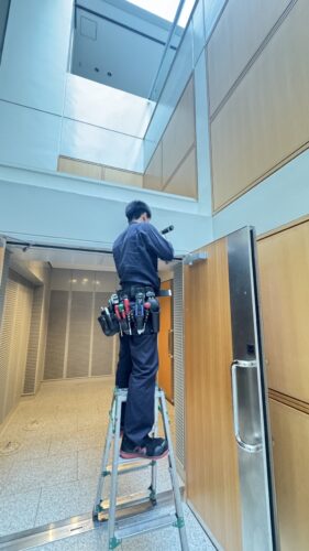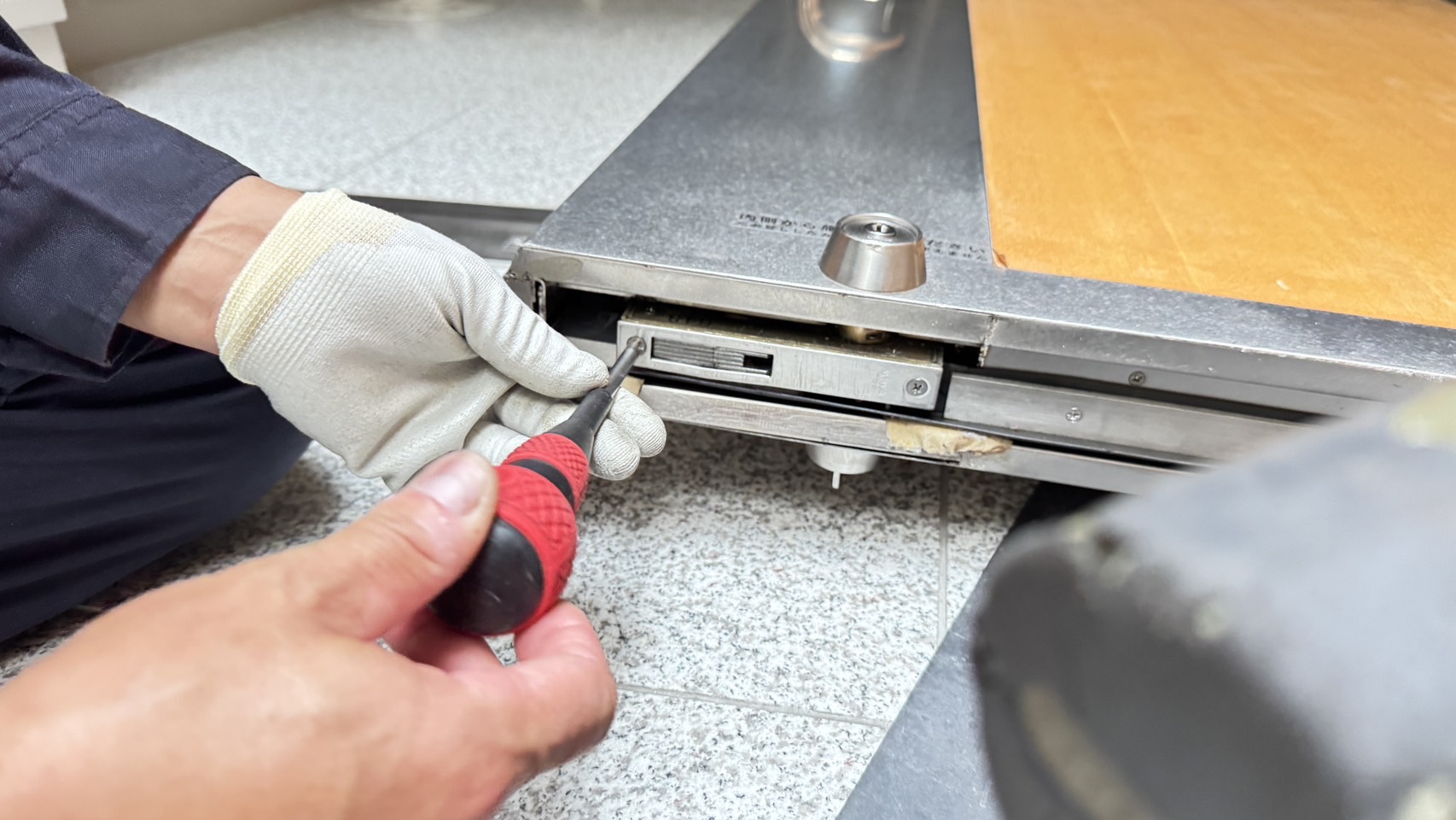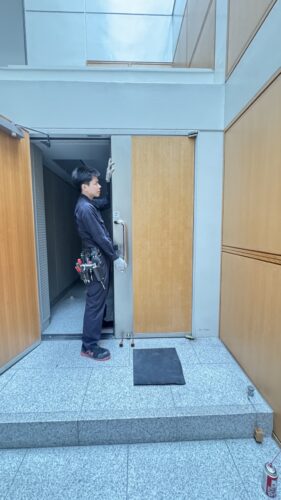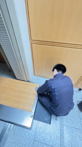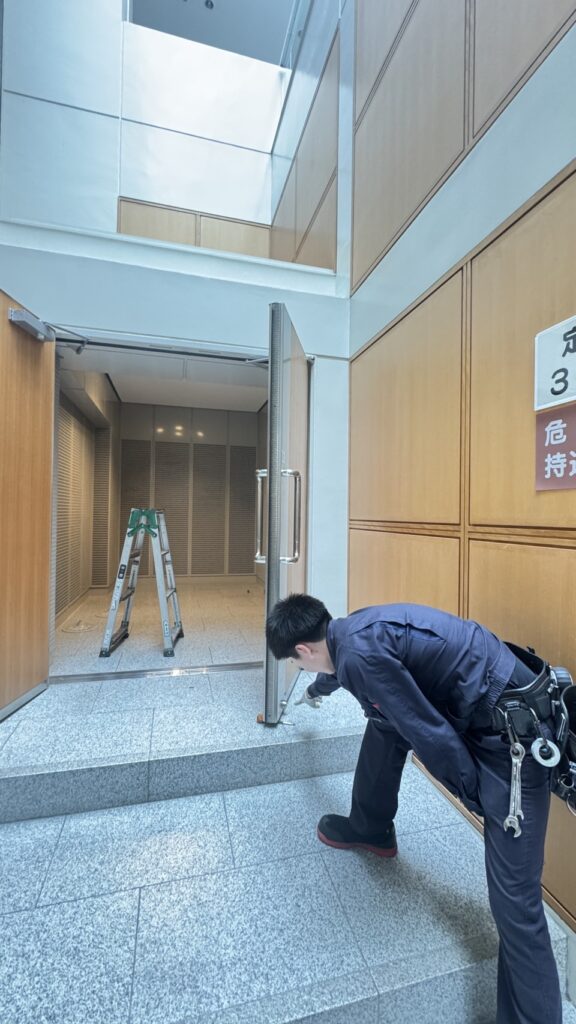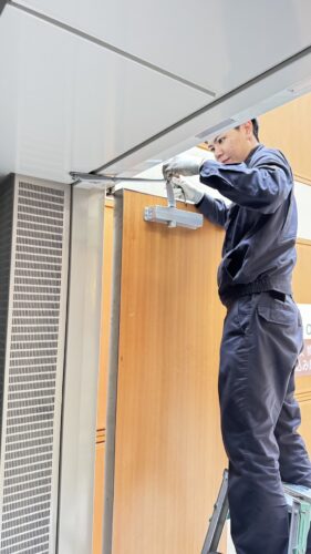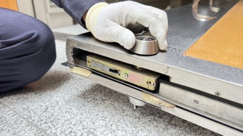 岐阜県立図書館建具修理の作業の内容は建具の下部に取り付けられた錠前が外れたものを固定する作業です。