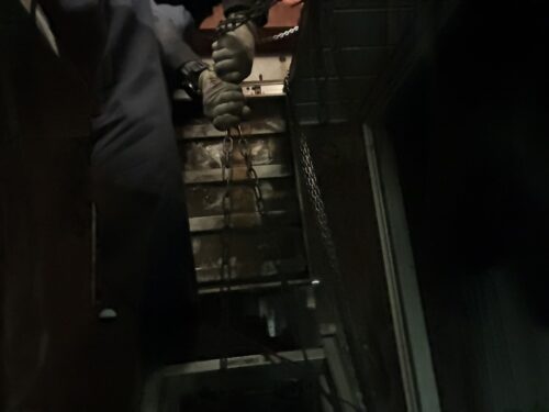 最近のシャッターには突然チェーンが切れてもシャッターが急降下しないような装置がついていますが、